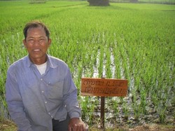 乾季SRIを実施するSさんとWさん。二人とも1年前にJVCの乾季SRI研修に出て、前回の乾季に初めてSRIを実践した人々だ。去年気に入って今年もやっているわけだが、去年との大きな違いが2つ。1つは去年よりもSRIの田の面積を大きく増やしたこと。もう1つは化学肥料の使用を大きく減らしたことだ。