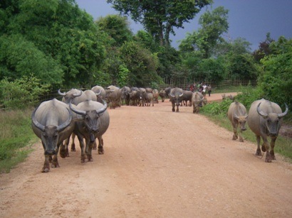 以前カンボジアにもいたが、農村の風景における違いとして気がつくのが、家畜の数の違い。ラオスではカンボジアと比べて家畜の数が少なく感じることがある。これには、より森林の豊かなラオスでは放し飼いをしていて、家畜が村人の居住地から遠くにいるため、少なく感じる、という印象の問題が一つある。同時に、主にタイを通じてハンディートラクターが入ってきているラオスでは、それまで田起こしを担っていた水牛を売ってハンディートラクターに換えた人がいるため、実際に家畜の数が少ないと思われる。