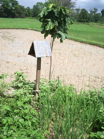 SRI田植え直後の頼りない田んぼ。その手前にあるのは精霊の祠で、そこには稲が植えてある。これは精霊に豊作を祈るもので、本田よりも早く、一番最初に植えなくてはならない。植えるのは7箇所(7束)と決まっており、収穫後は食べても良い。SRIの田にも精霊のご加護がありますように。