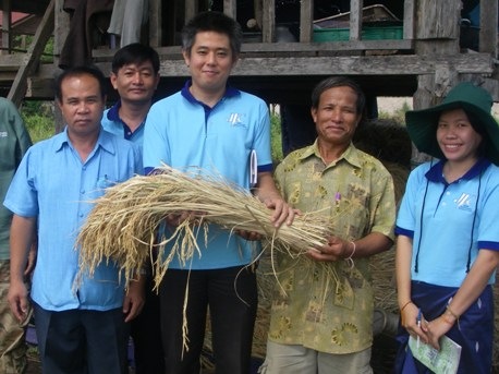 SRIを実践するモデル農家を訪問。見事に実ったSRI米とともに、写真撮影。郡当局からも多くの人が訪れ、モデル農家も非常に誇らしく思ってくれたと思われる。このモデル農家は、のちに県の会議でもモデル農家としての証書を渡されています。
