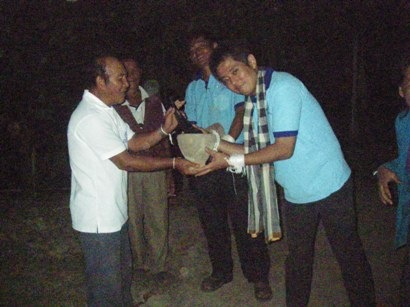 ある村での出来事。ケーン(竹でできたラオスの伝統楽器)とともに、水牛の角でできた笛で踊り、最後にはその角笛をいただくことになった。笛といっても吹き口があるだけで、穴などは開いていない。穴を塞いだり開けたりすることで音程を取るらしい。