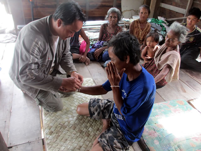 最後に家を出るときは、スタッフらとバーシーの儀式として、病気の回復を願いながら白糸をカンスアンさんの手首に巻いてきました。