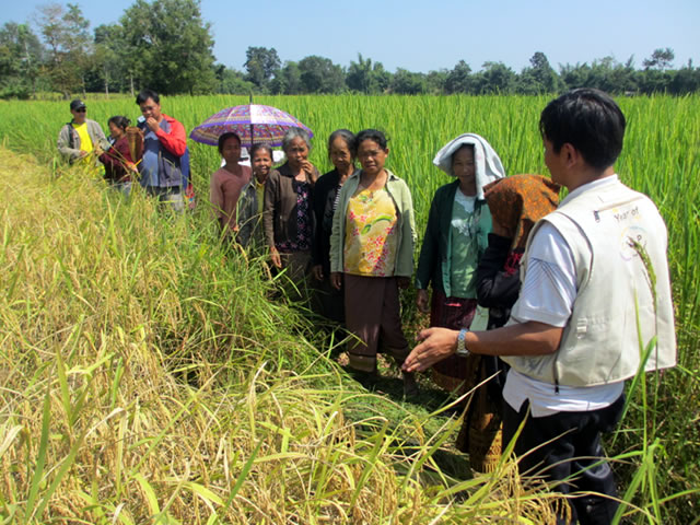 アサポン郡の4つの村から、SRIを実践したことのある人、ない人、両方を含めた合計20名の参加がポンンガム村に集まりました。家族の中で、どの田んぼにどの品種の米を使い、どんな植え方にするかを決定するのは概して男性の仕事。しかし実際に田植えをするのは女性の仕事です。そのため、良い植え方(移植)とはどういうものか、どのような育て方が良いのか、などをきちんと理解してもらうために開催しています。