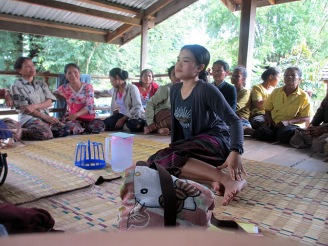 そんな雰囲気の中の経験交流で大活躍したのが、JVCスタッフのオバンティーンでした。彼女はアサポン郡の対象村であるポンペン村の出身で1年前からJVCで働いています。少数民族の村出身のスタッフは、学歴が高い低地ラオ族の他のスタッフと自分を比べ消極的になることが多く、彼女もまさにそのひとりでした。