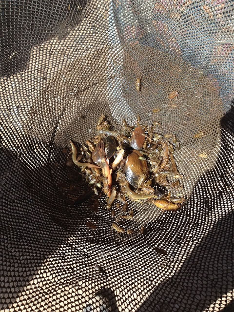 前回のおばあさんとの会話で出てきたビン(※カゴのような魚を獲る道具)ですが、いったいどんなかたちをしていて、どんなモノが獲れるのでしょうか。まずかたちは丸くて直径はそれなりに大きく、網が張ってあるものです。中を見せてもらうと、小さなドジョウのようなものの他、貝や水棲昆虫が入っていました。