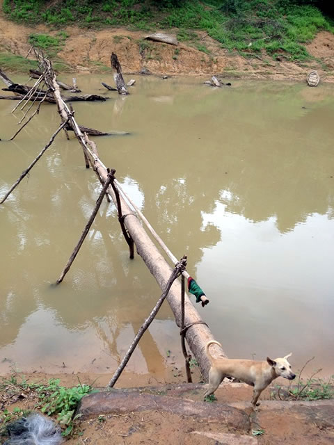 こちらの写真を見てもお分かりのように、橋の本体は竹で、なかなか不安ではありました。ちょっとした「風雲たけし城」状態でしょうか(古いか)。筆者も含め全員無事渡ることはできました。実はこれは6月でしたので、となりで子どもたちが魚をとっているように、川はまだ浅く、橋が流される不安はありませんでした。その後3ヶ月、ずっと雨季ですから水位は変わっているはずです。この橋はどうなったのか、また今度聞いてみます。