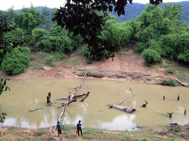 JVCが推進する魚保護地区の活動ですが、川は村同士の境界になっていることが多く、両岸の村が合意して一緒に管理していかないことには成功しません。ある村では、対岸は村が違うどころか別の県の別の郡に属しますが、そちらの郡行政とも連携しながら両岸の村の対等な参加のもとに活動を進めています。さて、上の写真、遠目ですがお分かりになるでしょうか。橋の前にはJVCのスタッフと郡の行政官。スタッフの荷物を持っています。右手は村の話し合いで使った模造紙でしょう。
