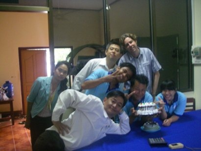 昨年のことだが、12月のJVCラオスは誕生日ラッシュ。誕生日にはお金を出し合ってケーキを買っているが、実に5人が12月生まれなので12月は毎週ケーキだ。その先陣を切ったのは運転手のクム兄さん。「代表が話があるって」と他のスタッフに言われて、「なんだろう」とやや不安げ?に会議室に入ってきたクム兄さんに、「誕生日おめでとう!」。ラオスではあまり誕生日を盛大に祝う習慣がなく、するとしたら最近の街の子どもくらいで、クム兄さんの世代ではなおさら。齢53歳にして初のバースデーケーキに、うっすら涙ぐむクム兄さん。いやー良かったです!