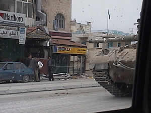 ベイトジャラでは2時から6時まで外出禁止令が解除された。しかしベツレヘム地区での移動はできない。境界では戦車が配備されている。住民は戦車の銃口から逃げるように食べ物を抱えて家の中へと駆け込む。不審だと判断されれば家ごと吹き飛ばされるかのようだった。軍事封鎖下に置かれた住民のストレスは相当なもので、神経性胃炎や高血圧、不眠症などの症状を訴える人たちも多いという。