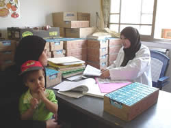 初日の7日、牛乳とビスケットの配給を担当した看護師のナジュワさんは大忙しでした。子どもの体重を測定し、母親の様々な相談に応じ、栄養についてのアドバイスなどの保健指導の後、一人ひとりに牛乳を渡していました。クリニックは人が入りきらないほど混雑していましたが、ナジュワさんの部屋には必ず一人ずつ入ってもらい、母親が安心して話ができるように配慮されていました。7日は、約40人に牛乳が配られました。