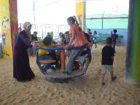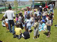 初日の6月26日、なんと予想を上回る150人以上の子どもたちが登録しました。実質的な活動がはじまる27日は、センターでの歌や体操のレクリエーションの後、バス3台で、車で10分の所にある新しくできた公園に行きました。子どもたちは大はしゃぎで芝生の上を駆け回り、シーソーやブランコで遊んでいました。スタッフも初日から声をからしてがんばっていました。日本ではどこにでもあるような普通の小さな公園ですが、難民キャンプに住む子どもたちにとっては特別な場所なのです。子どもたちの喜びを知って、急遽スタッフとセンターの代表のアッザさんは翌日と翌々日の予定を変更、公園の管理者と交渉し公園の隣にあるホールを借りて予定していた絵画プログラムを行い、その後子どもたちが公園で遊べるように、調整しました。もちろん子どもたちは大喜びです。