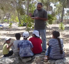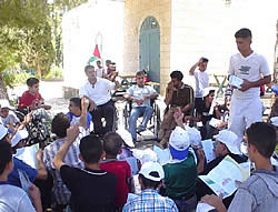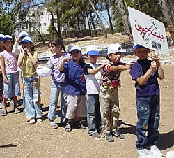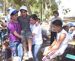 ここは元々小さな林だったのですが、インティファーダが始まってから失業率が上がり経済が悪化、その対策の雇用創出事業として国際機関の支援を受けてキャンプ場として整備されました。またキャンプの活動として、子どもたちは同じ敷地内にあるリハビリテーションセンターの青年たちから、車椅子での生活について学びました。子どもたちは積極的に質問していました。最終日のパーティーにはその青年たちも参加し、青少年リーダーは彼らを車椅子ごと持ち上げ、一緒に踊りました。