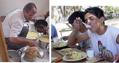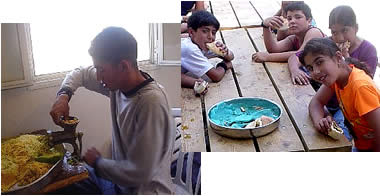 地元の慈善団体からは、米、スパゲッティ、油、豆、トマト缶等の食料の寄付を受けました。ヒヨコ豆は、ファラフェルと呼ばれるコロッケのような揚げ物にします。青少年リーダーが汗だくになりながら器具を使って豆をミンチにし、野菜や香辛料を加えて油で揚げ、それを野菜と一緒にパンにはさんで朝食や夕食にしました。これは大好評で、大皿いっぱいのファラフェル入りサンドイッチがあっという間になくなりました。