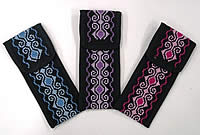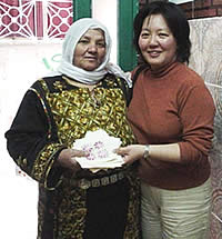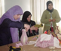 上の写真で女性がつぼに貼り付けている古いドレスの模様部分は、「エジプトへの道」と呼ばれる伝統パターンです。この模様は女性グループの作品の中にも取り入れられていて、ペンケースを作成しています。