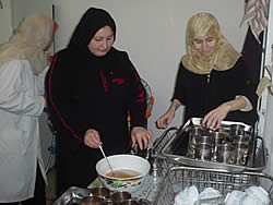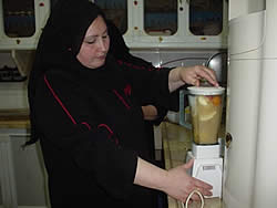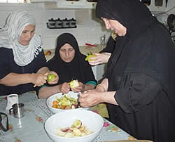 2食目の新鮮な果物を使ったジュース作りに入ります。値段が安く栄養価も高い季節の果物を使います。家庭でも手に入るものを使うことが大原則です。この日は、びわ、スモモ、なし、の組み合わせでした。担当の母親たちが手際よく果物の皮をむいていました。