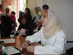 看護師が次回の一人ずつ、今日のセンターでの子どもの様子や次回の予約を確認していきます。ほとんどの母親はセンターに通う交通費が払えないので、乗り合いタクシーのルートを確認して、交通費の実費を渡していきます。