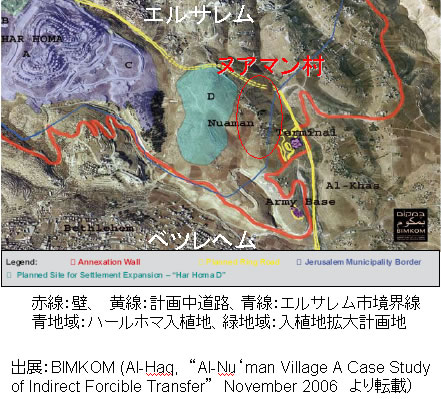 ヌアマン村の地図1967年にイスラエルが東エルサレムとその周辺を併合した際、ヌアマン村の土地はエルサレム側に取り込まれましたが、住民は西岸の住民として記録され、イスラエルの住民票(イスラエルID)は発行されず、自宅に住んでいるだけでイスラエルに違法滞在していると見なされてきました。そして、エルサレム市はヌアマン村での新たな建物の建築を禁じてきました。1993年にヌアマン村の住民はイスラエルの最高裁に対して、村を西岸と承認するかあるいはイスラエルIDを住民に発行するよう求めてきました。裁判所はエルサレム市と内務省に対してヌアマン村の問題の解決を求めましたが、具体的な合意に至らずに現在に至っています。