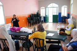 保健指導員から応急処置講習を受けるボランティアさんたちサマー・プログラムの始まる前には、ボランティアさんたちが集まって、パレスチナの医療団体である医療救援協会の保健指導員から応急処置講習を受けました。3日間の集中コースで、特に子どもたちが遊んでいる時に起こる可能性が高い怪我や病気などについて、適切に処置できるよう、実践も含めて学びました。講習を受けたパレスチナ子どもセンターのボランティアの女の子は、「何かがあった時に私たちが焦らずに動けるのが大切だと思った。処置の仕方を実際に体を使って習えてよかったわ」と、言います。ボランティアさんたちにとっても、子どもたちが楽しく安全に活動できるのが一番なのです。ズフール・センターで社会福祉士として働く女性は、「講習を受けることで、ボランティアの子達は自分たちのリーダー意識も高まって自信もつく。サマー・プログラムが楽しみだわ」と嬉しそうに言いました。