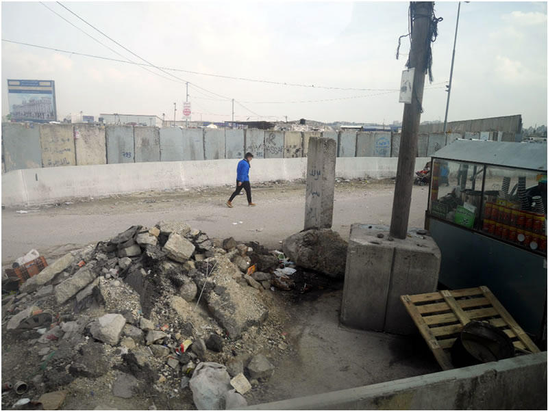 ここで搭乗時間となってしまい、会話を終え、挨拶をして別れましたが、イスラエル人がいかにパレスチナ人たちと接する機会がないか、それゆえにいかにパレスチナのことを知らないか、という現実をこういった機会にいつも再認識します。今の若い世代のイスラエルは西岸に行ったことのない人たちがほとんどです。イスラエル人左派活動家の女性によれば、2000年から始まった第二次インティファーダのあと、イスラエルとパレスチナ、またパレスチナ人どうしを隔てる障害物(例えば写真の分離壁や検問所など)ができ始め、そこから徐々にイスラエル人は西岸の都市に行かなくなったとのことでした。現在も西岸のエリアA(行政権も警察権もパレスチナ側が担っている自治区のエリア)の手前には、「この先はパレスチナのエリアです。イスラエル市民にとっては危険、入域はイスラエルの法律で禁止されています」※2 と書かれた赤い看板が置かれています。正確には、軍法によってイスラエル人がエリアAに入ることが制限されているそうです。彼女は、「1990年代はよくラーマッラー(自治区の中心地)に言っていたわ。2000年の9月まで行っていたのは確かね。その頃は西岸に行くことは禁止もされていなかったし、イスラエル人と分かったからってパレスチナ人から攻撃されることもなかった」と当時のことを話していました。