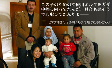 エルサレム事務所の小林和香子と福田直美が1月26〜28日にガザ地区に入り、先天性代謝性疾患の子どものための治療用ミルク(10人分、3−5日間)分を持参して届けました。