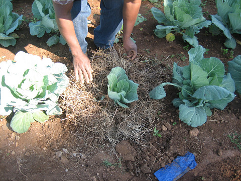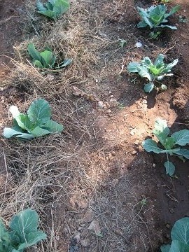 今回指摘された「野菜でこぼこ」に対しては、マルチ(枯れ草で土を覆う)と堆肥(牛やヤギの糞)を使うことの重要性と「虫食い」に対しては混作の具体的な方法などが伝えられました。これらはすでに繰り返し学んできているはずなのですが、シンプルすぎる方法ゆえに、その重要性が忘れ去られがちです。そんな様子を感じ取ったトレーナーは一度に菜園を改善しようとせず、自分たちで違いを実感してもらうように一部の場所だけに手を入れました。