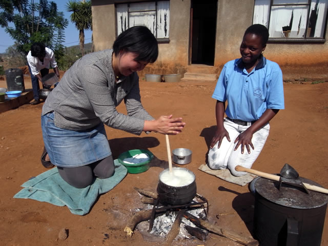 南アでの主食の一つ、メイズ(とうもろこし)の粉をお湯で練り上げた「パップ」を作るのはなかなかの力仕事です。最初にメイズの粉を泡立て器でお湯になじませ、固くなってきたら大きなしゃもじに代えて、お鍋に叩きつけるようにして練り上げます。ジョバーグの友達の家の泡立て器は、お餅のように硬くなりなじめたパップに耐え切れず、壊れてしまっているのをよく見かけました。