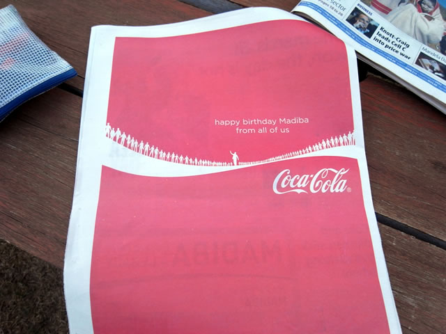 マンデラ氏の実の子どもたちは、新しいファッションブランドの立ち上げを発表し、その売上の一部は、マンデラ財団が建設を予定する小児病院に寄付されるとのこと。他にも、さまざまな企業が、「Happy Birthday」のメッセージとともに、自らの寄付内容を掲載した広告を出していました。