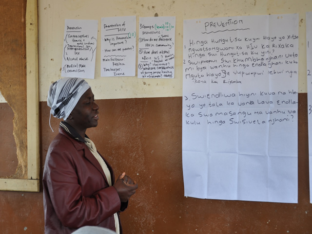HIV/エイズ予防に関しては、コンドームの使用など予防のしかたよりも、それをどう地域社会の中で受け入れられるように、伝えていくかということが課題。研修中にも、コンドームの使い方などについては、多くの訪問介護ボランティアは問題なく理解していました。が、伝える立場になると「セックス」という言葉を使わずに、遠回しに答えたり、コンドームの使い方を実践するのに抵抗のあるボランティアも見受けられました。