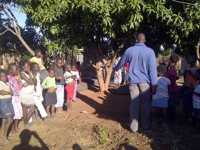 4月中に、ヒャンガナニ村のドロップイン・センター(※注)の敷地内で行った家庭菜園研修。今日は、その際に子どもたちと一緒に植えた野菜や果樹のお世話をする担当を決める日です。