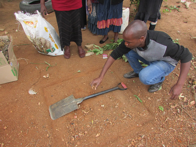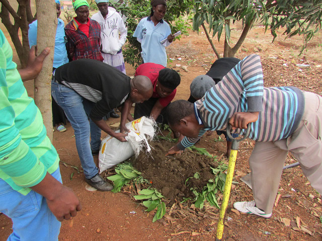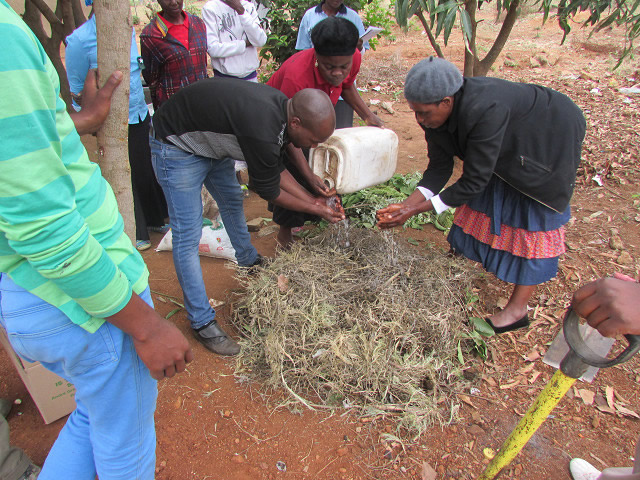 10月8、9日、私たちが活動する9村のうちボドウェ村とシャンガナニ・タウンシップ(※注)で21名を対象に有機堆肥と液肥のつくり方に関する研修を行いました。いずれも親がいないなど特別なケアが必要な子どもたちが集まるドロップ・イン・センターの敷地で行いました。