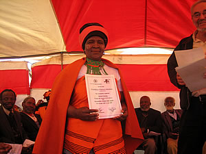 ■2008年8月には19名の篤農家がトレーナーとして表彰 された。写真はレベルスクルーフ村のノミカヤさん。 |