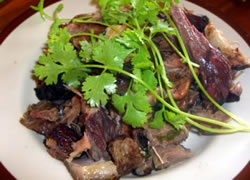 さて、頭(顔)はどうするのかと言えば・・ 丸ごと蒸していただきます。塩をぬり、レモングラスとパクチー(香菜)を入れて、炭火で長時間蒸します。油たっぷり(コラーゲンたっぷり?)の蒸し豚は、BBQとはまた違ったおいしさ。タイ風の辛いタレといっしょに食べると、二度目の感謝と幸せ。