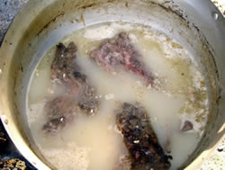 次は骨です。朝から豚骨を炭火にかけること5時間。 塩、胡椒、にんにく、パクチーの根などを入れ、こってり豚骨スープのできあがり。肉は、骨からホロホロと崩れ落ち、スープの中に舞っています。お米でできた麺をいれて、タイ風豚骨ラーメンです(30時間煮込むと、大きな骨までボロボロっとくずれるほどに。さくさくした食感で骨まで食べつくせます)。まずは何もいれずに、日本風ラーメンの味を楽しみ、その後には一味唐辛子やお酢、ナンプラーを入れて、タイ風の味も楽しみました。三度目の感謝と幸せ。