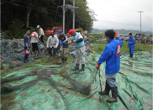 現在、JVCは、Kさんの奥さんの依頼を受けて、津波によって絡まり合い使用不能となった網の仕分け作業を行っています。その網は、冬場に行われる「大目流し漁」(マグロ・メカジキ・サメなど)に使われる予定です。この作業には、気仙沼市社会福祉協議会ボランティアセンターの協力を得ています。連日、20人から30人のボランティアが、この活動に参加しています。