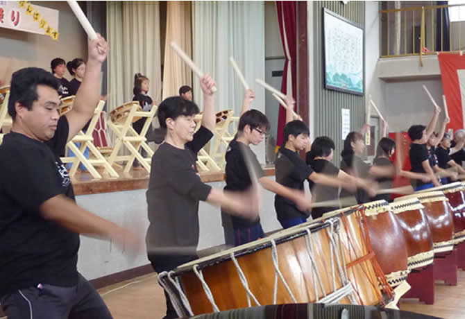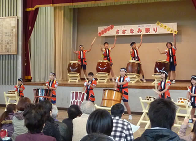 「さざなみ祭り」は全児童による太鼓の演技披露から始まった。本校の真下に開ける小々汐地区で打囃子うちばやしを受け継いでいる「小々汐打囃子保存会」の指導を受けてきたものだ。力強い太鼓の響きが来場者を圧倒し、その後の踊り・合唱・楽器演奏・自由研究などの発表にいたるまで、場内は児童を注目し続けた。