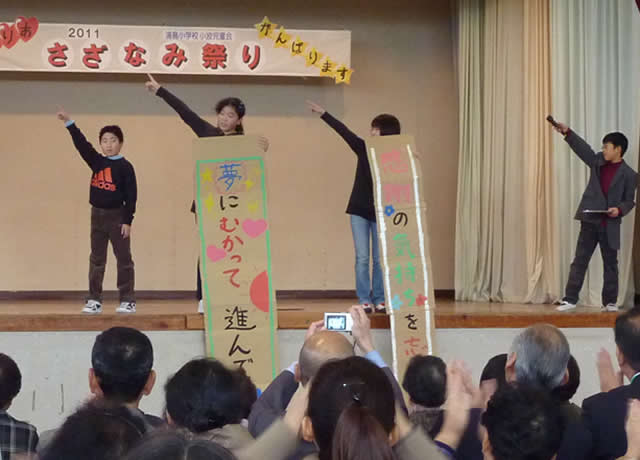 11月20日、四ヶ浜で育った人々の心のふるさとである浦島小学校で「さざなみ祭り」と称する学習発表会が開催された。この祭りは、運動会・学芸会・児童会イベント・収穫祭(会食会)の4つ行事を合体させた大イベントであった。震災のダメージを地域と分かち合ってきた本校では学校行事にも影響が及び、児童の学習成果がこのような形で発表されることとなったのだ。