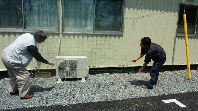今年の夏を迎えるにあたりJVC気仙沼事務所は夏の暑さ対策として様々な方法を検討してきました。いくつかある候補の中から、まず、最初に遮光ネットを屋根の上に取り付け室内温度の軽減を図る方法を実験しました。しかし、実験の結果、遮光ネットでは室内温度の軽減に有意な効果を認めることが出来ませんでした。そこで、他団体でも実施しているグリーンカーテンを設置して暑さ対策を講じていくことにしました。