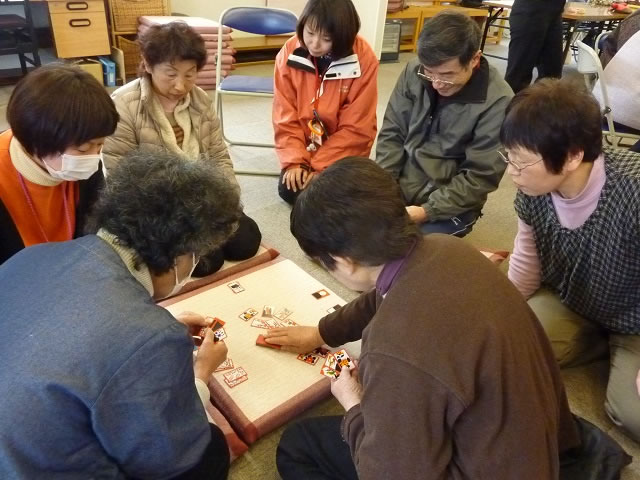 1月29日、鹿折中学校仮設住宅の集会場にて第7回「あづまっぺ!『趣味のじかん』」を開催しました。今回は「新年会」を企画し、福笑い、カルタ取り、花札や健康麻雀など数種類のゲームを行いました。