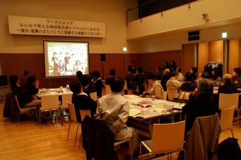 午後からは、神戸のFMわぃわぃの協力を得て、ワークショップ「みんなで考える南相馬災害FM放送のこれから」を開きました。市民の広い層が、これまでの災害FM放送の活動を共有し、これからの災害FM放送のあり方を考えるのが狙いです。商議所、社協など各種団体、地域の代表、市役所職員など地元の25人に、外部からの有識者など約40人が参加しました。