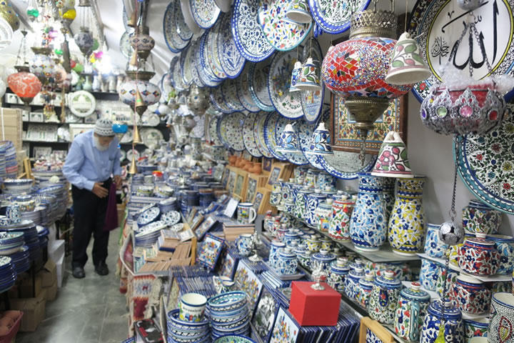 とはいえ、観光地でもあるので、このエルサレム旧市街には、素敵な雑貨屋さんが軒を連ねています(このギャップがなんとも言えないのですが・・・)私のお気に入りは、この食器屋さん。パレスチナ自治区のヘブロンという街の、有名な陶器です。