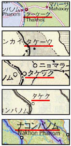 出版されている物でもこれだけ表記が違います。一番下は対岸のタイ領ナコンパノムと明らかな間違え。結構こういった誤植が多いのはマイナーゆえの宿命?