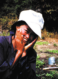 カメラを向けると恥ずかしがって顔を隠す農村の女性(タケーク周辺) |